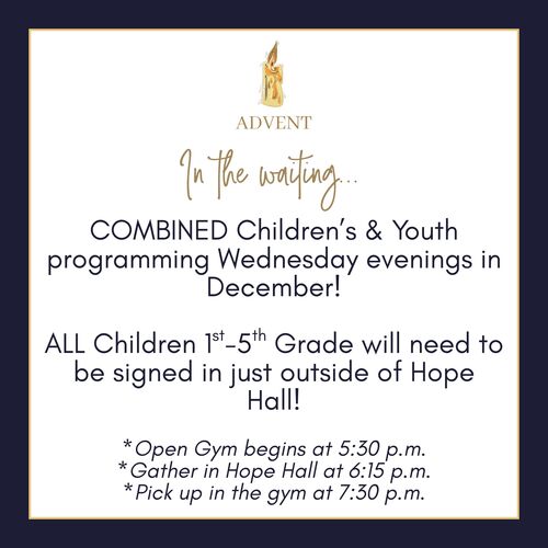 During the month of December (12/14, 12/21, and 12/28) ALL 1st-5th Graders will meet TOGETHER for Sunday School in The Refuge!
